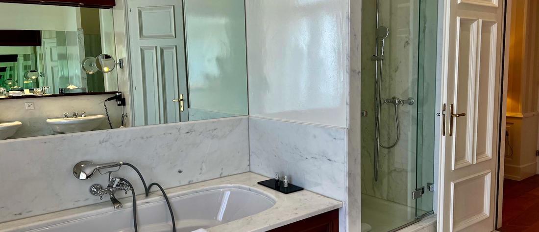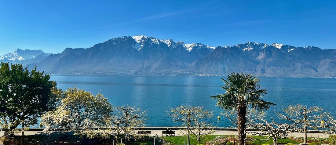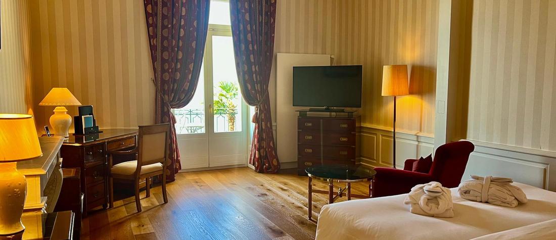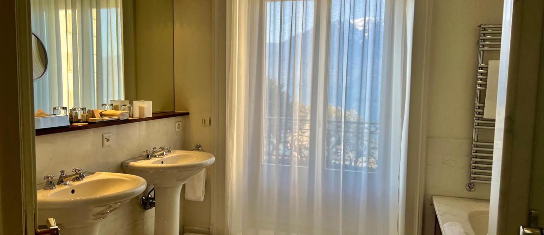 The Royal Ustinov Lac Suite offers breathtaking views of Lake Geneva and the Alps, spacious and unique, featuring a private bathroom in white marble directly overlooking the lake.